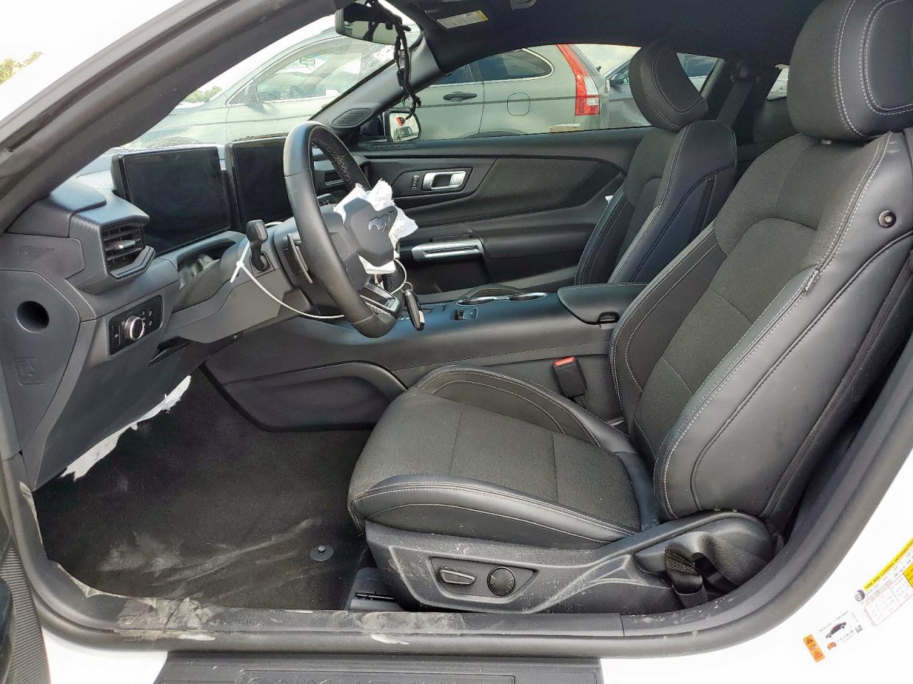 Inside, the Mustang has taken a leap forward. All trims feature a digital cockpit with a 12.4” instrument cluster and a 13.2” SYNC 4 touchscreen, integrated into a single curved glass panel in Premium trims. Materials vary from cloth and vinyl on base models to ActiveX faux leather and real leather on GT and Premium trims, with optional suede, contrast stitching, and Dark Horse logos. Ambient lighting, aluminum trim, and fighter-jet-inspired toggles evoke the cockpit theme.