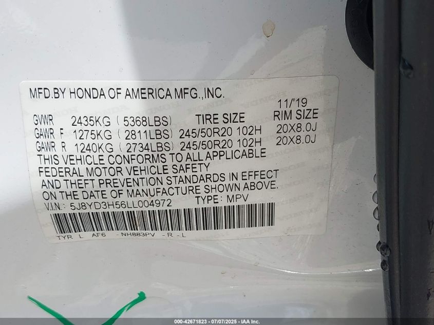 2020 ACURA MDX | 5J8YD3H56LL004972