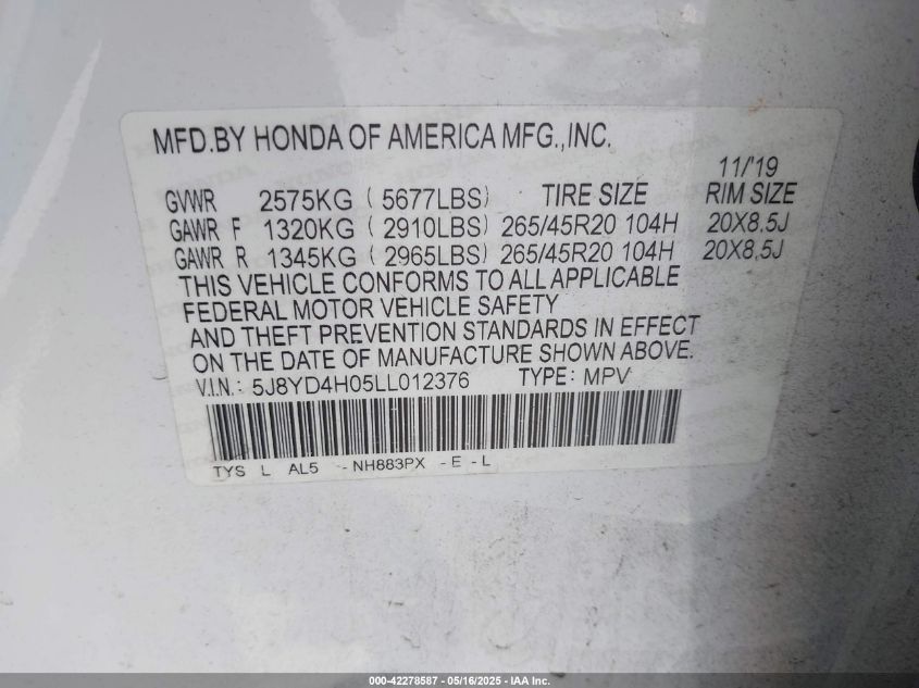 2020 ACURA MDX | 5J8YD4H05LL012376