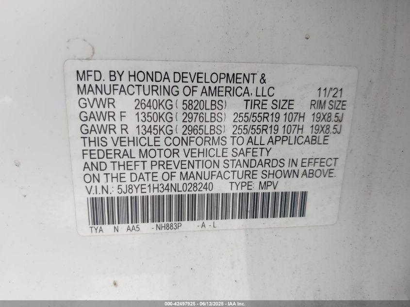 2022 ACURA MDX | 5J8YE1H34NL028240