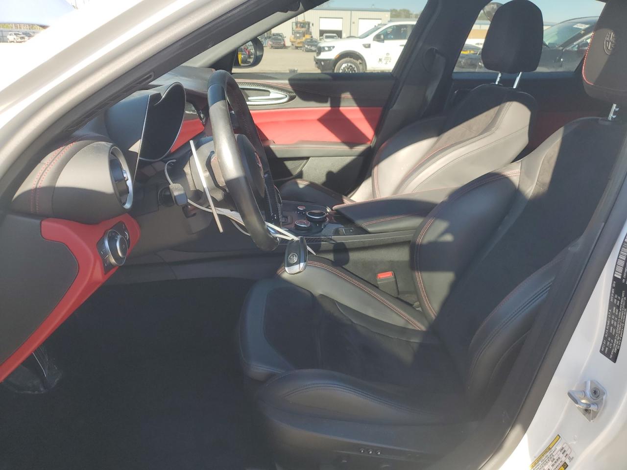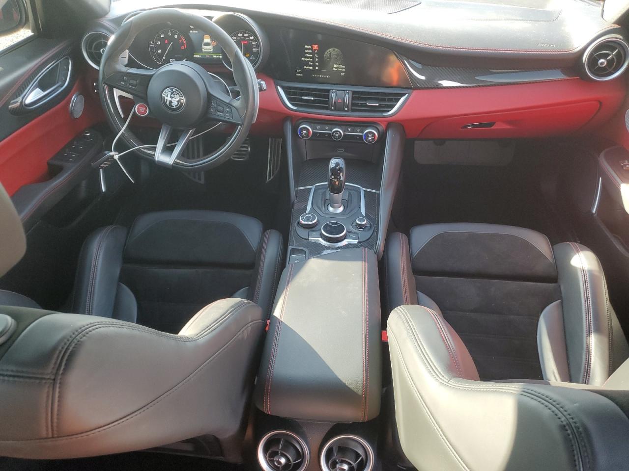 Inside, the Giulia offers a range of interior color combinations and materials. Standard models feature premium leather upholstery in shades like Black, Tan, and Red, complemented by aluminum or wood trim accents. The Quadrifoglio variant elevates the cabin with available carbon fiber trim, Alcantara inserts, and sport seats that provide enhanced lateral support. Attention to detail is evident in the contrast stitching and high-quality materials used throughout the interior.