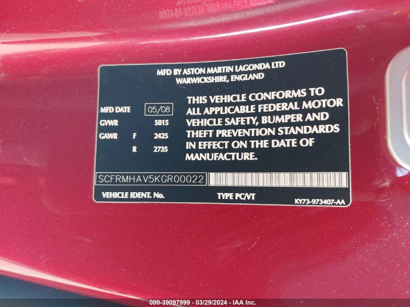 2019 ASTON MARTIN DBS | SCFRMHAV5KGR00022