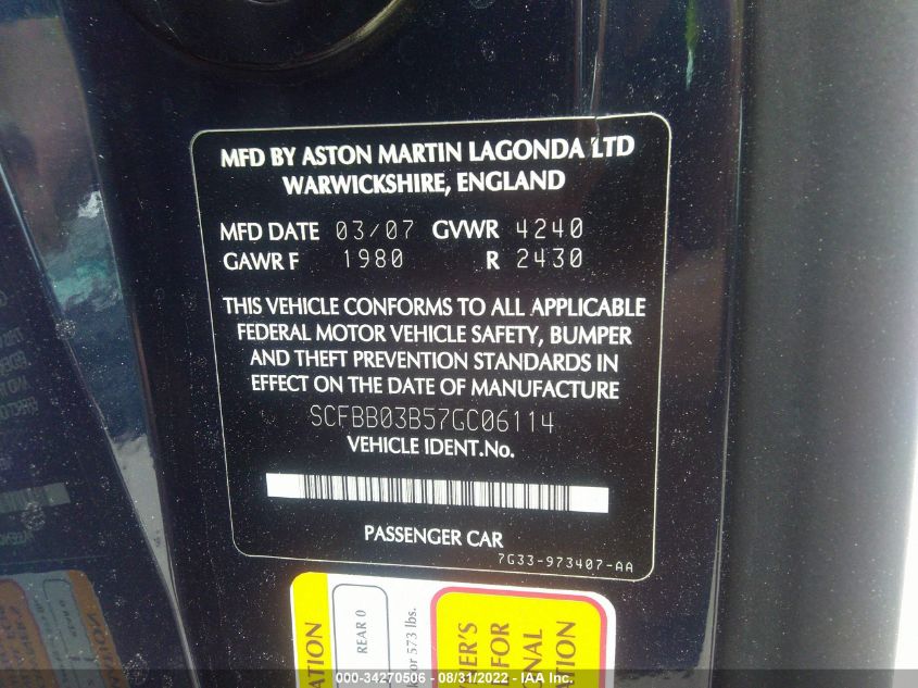 2007 ASTON MARTIN V8 VANTAGE | SCFBB03B57GC06114