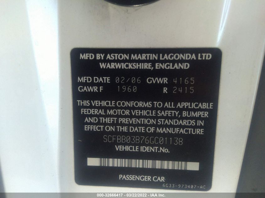 2006 ASTON MARTIN V8 VANTAGE | SCFBB03B76GC01138