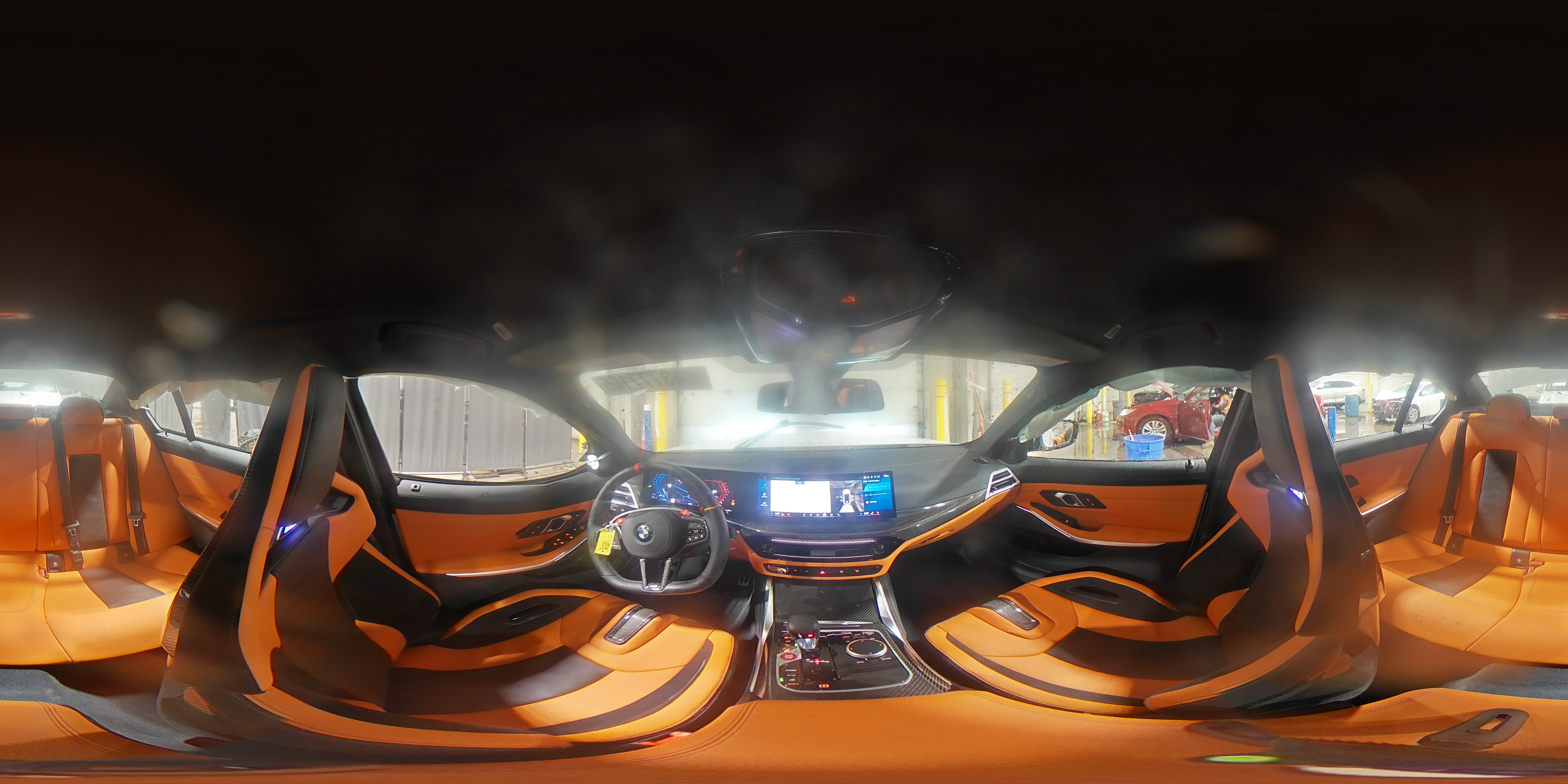 The interior features Merino leather upholstery as standard, with available themes like Black with M Tri-color stitching, Yas Marina Blue/Black two-tone, Kyalami Orange, Silverstone/Black, and Fiona Red/Black. Optional M Carbon Bucket Seats provide improved lateral support and a visible carbon shell. Dashboard and door trims are finished in aluminum tetragon, carbon fiber, or open-pore wood, depending on package and trim.
