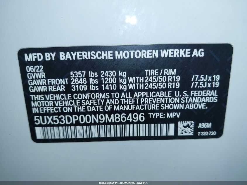 2022 BMW X3 | 5UX53DP00N9M86496