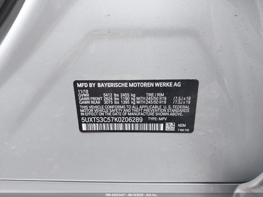 2019 BMW X3 | 5UXTS3C57K0Z06289
