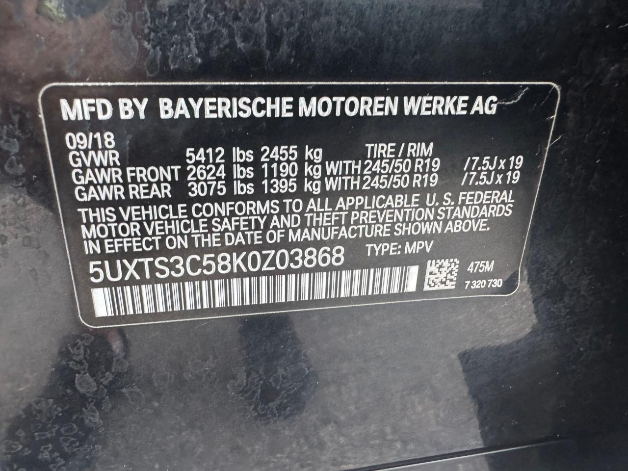 2019 BMW X3 | 5UXTS3C58K0Z03868