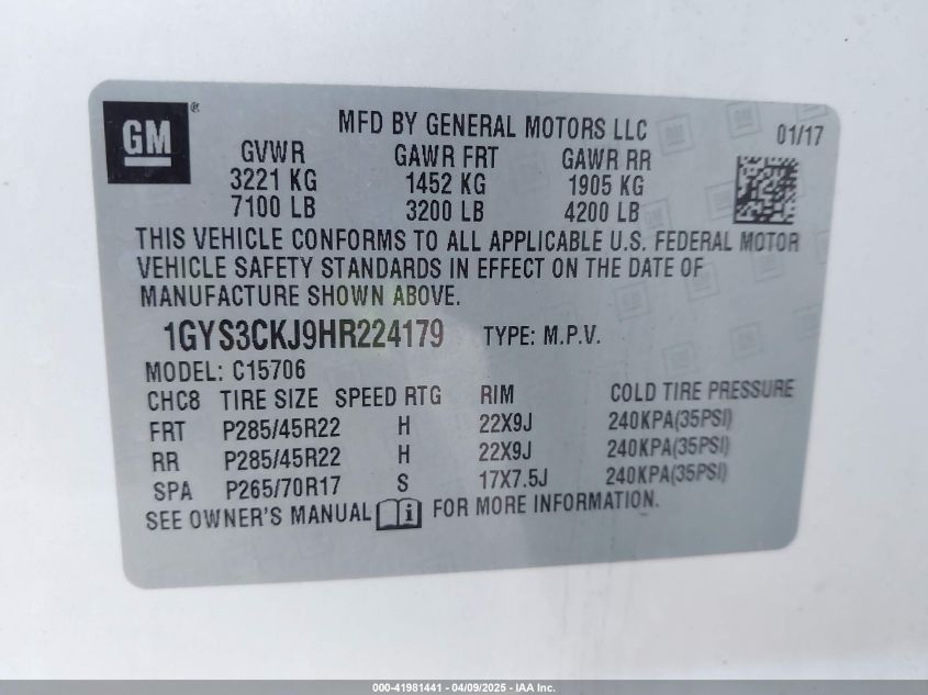 2017 CADILLAC ESCALADE | 1GYS3CKJ9HR224179