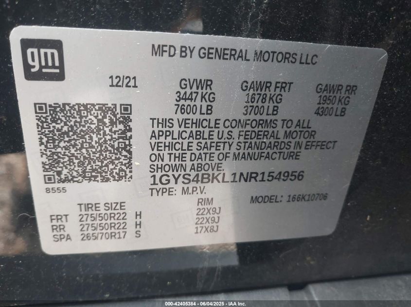 2022 CADILLAC ESCALADE | 1GYS4BKL1NR154956