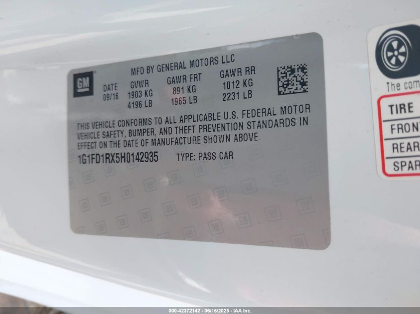 2017 CHEVROLET CAMARO | 1G1FD1RX5H0142935