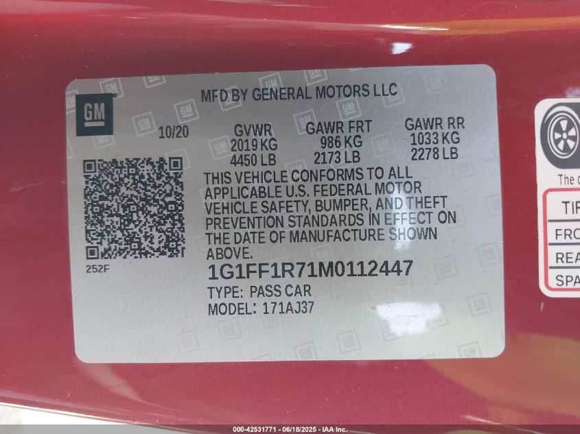 2021 CHEVROLET CAMARO | 1G1FF1R71M0112447