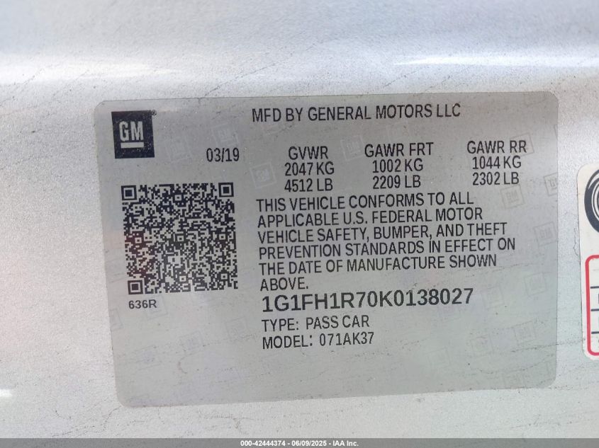 2019 CHEVROLET CAMARO | 1G1FH1R70K0138027