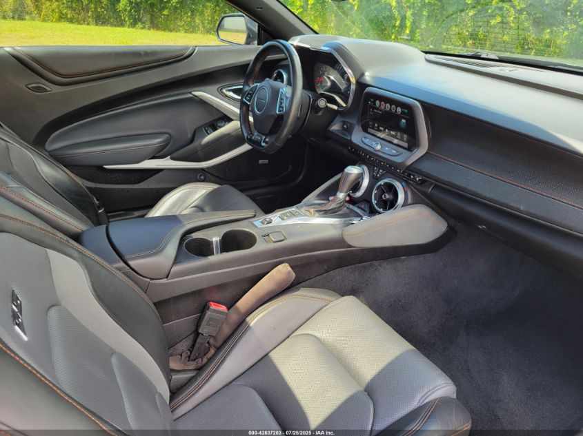 Inside, the Camaro’s cabin offered a range of materials and themes tailored to trim level and package. Base models came with Jet Black cloth or leather, while upper trims introduced two-tone leather combinations, suede inserts, contrast stitching, and ambient lighting. Colors like Kalahari, Adrenaline Red, Ceramic White, and Medium Ash Gray allowed for sporty or upscale personalization. Performance trims such as the 1LE and ZL1 featured Recaro sport seats, suede-wrapped steering wheels, red seatbelts, and minimalist, track-oriented trims. While the cabin retained a driver-focused layout, improvements over the previous generation included an updated infotainment system, digital instrument options, and more premium soft-touch materials.