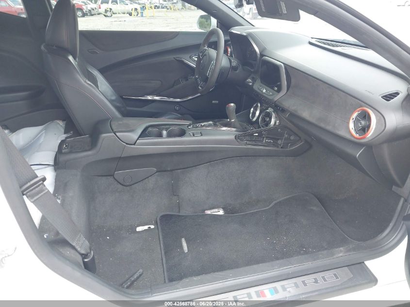 Inside, the Camaro’s cabin offered a range of materials and themes tailored to trim level and package. Base models came with Jet Black cloth or leather, while upper trims introduced two-tone leather combinations, suede inserts, contrast stitching, and ambient lighting. Colors like Kalahari, Adrenaline Red, Ceramic White, and Medium Ash Gray allowed for sporty or upscale personalization. Performance trims such as the 1LE and ZL1 featured Recaro sport seats, suede-wrapped steering wheels, red seatbelts, and minimalist, track-oriented trims. While the cabin retained a driver-focused layout, improvements over the previous generation included an updated infotainment system, digital instrument options, and more premium soft-touch materials.