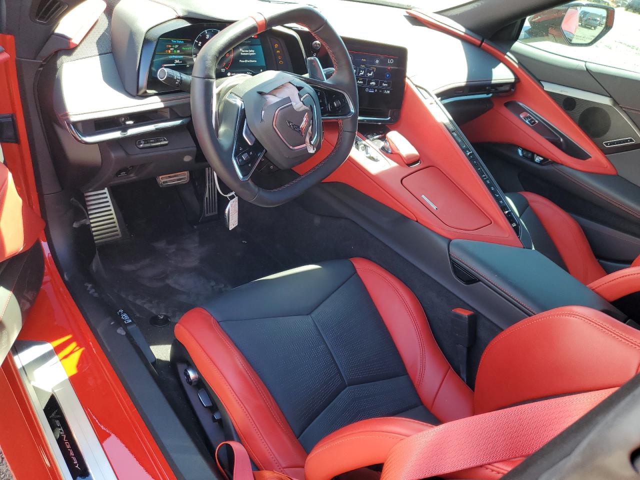 Inside, the C8 Corvette’s cockpit is driver-centric and deeply customizable, with an unprecedented selection of interior color themes and material combinations. Standard options include Jet Black and Sky Cool Gray, while upper trims introduce two-tone schemes like Adrenaline Red/Black, Natural Dipped, Tension Blue/Strike Yellow, and Morello Red. Buyers can choose from GT1, GT2, and Competition Sport seats, wrapped in Mulan or Napa leather with suede microfiber and contrast stitching. High trims also feature carbon fiber trim, aluminum accents, custom seatbelt colors, and a squared-off performance steering wheel with heating and paddle shifters. The 3LT trim in particular offers premium leather-wrapped surfaces throughout the dashboard and doors, enhancing the cabin’s upscale feel.