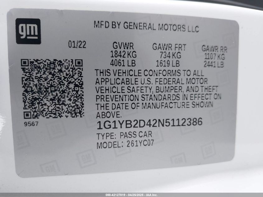 2022 CHEVROLET CORVETTE | 1G1YB2D42N5112386