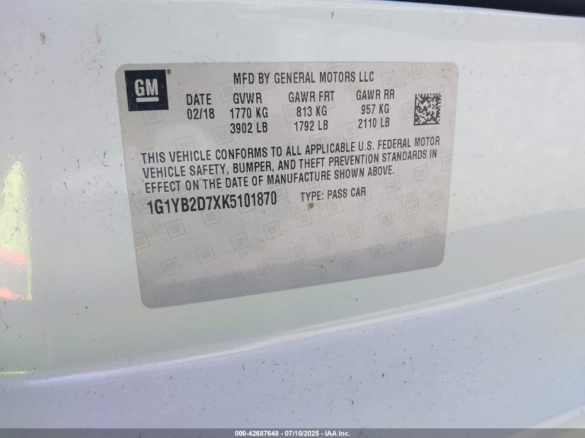 2019 CHEVROLET CORVETTE | 1G1YB2D7XK5101870