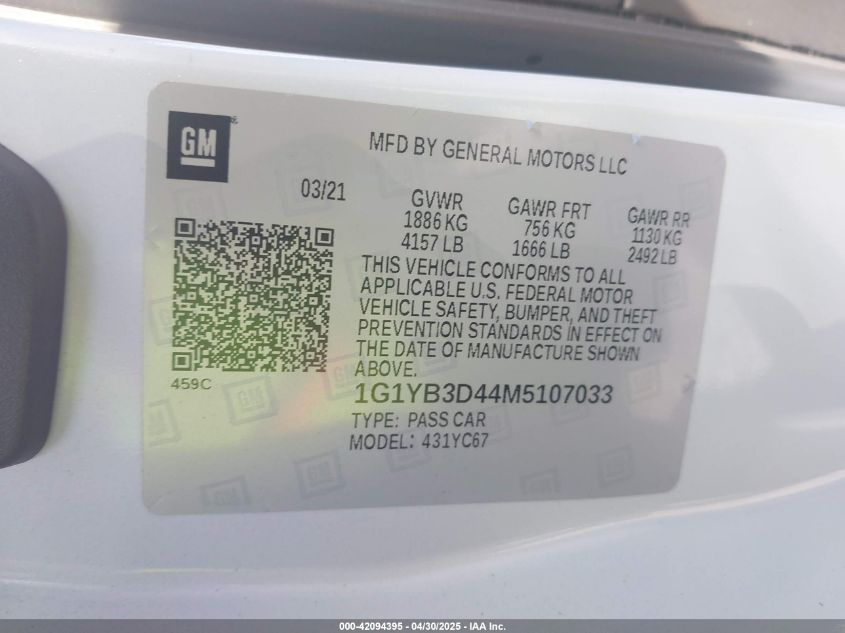 2021 CHEVROLET CORVETTE | 1G1YB3D44M5107033