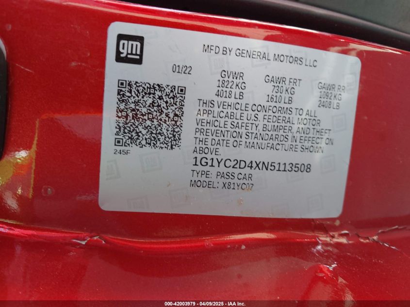 2022 CHEVROLET CORVETTE | 1G1YC2D4XN5113508