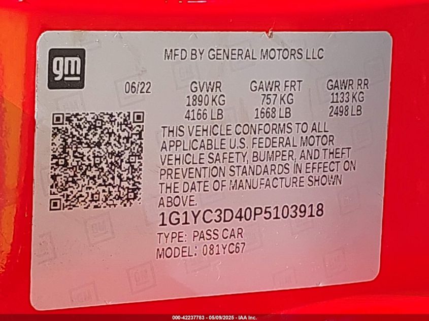 2023 CHEVROLET CORVETTE | 1G1YC3D40P5103918