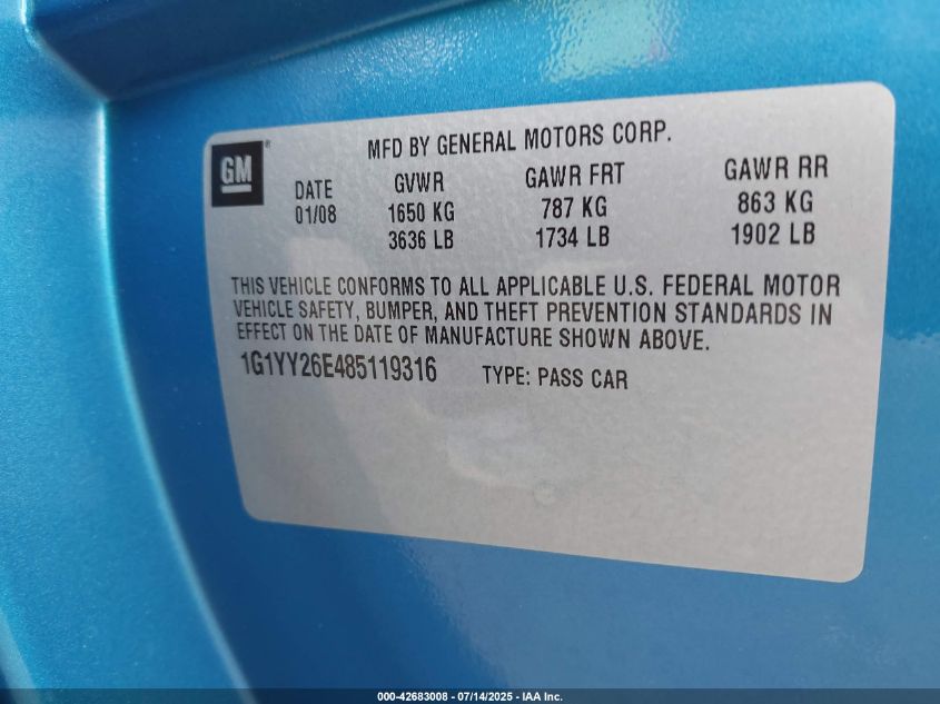 2008 CHEVROLET CORVETTE | 1G1YY26E485119316