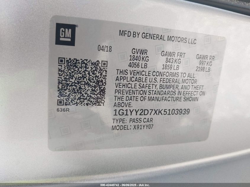 2019 CHEVROLET CORVETTE | 1G1YY2D7XK5103939