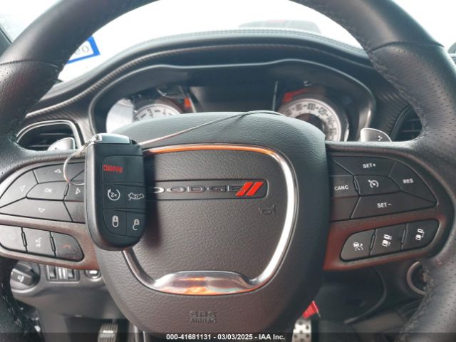 Inside, the Challenger continued its retro-modern blend, offering layouts that combined muscle car simplicity with modern comfort and technology. Standard models featured durable cloth seats in Black or Dark Slate Grey, while higher trims like the Scat Pack, SRT, and Redeye introduced premium Nappa leather, Alcantara suede inserts, SRT-embroidered headrests, and carbon fiber interior trim options. The dashboard design remained faithful to classic Challenger models, highlighted by a race-inspired instrument cluster, deep-set gauges, and a center stack tilted slightly toward the driver. Available equipment included heated and ventilated front seats, a heated steering wheel, and the Uconnect infotainment system with touchscreen sizes ranging from 7 to 8.4 inches, culminating in Track Pack performance pages for real-time telemetry.