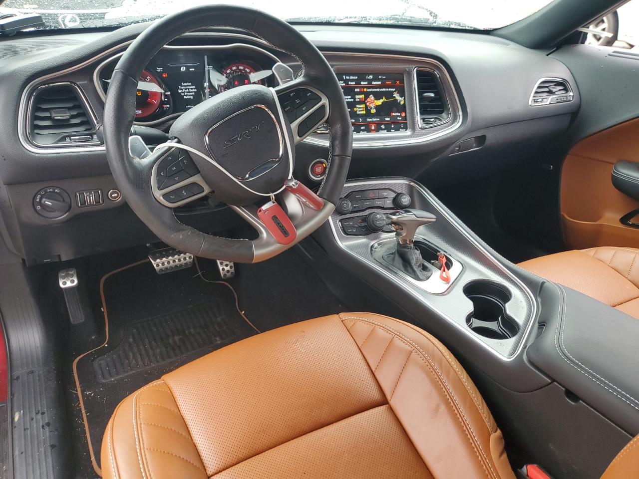 Inside, the Challenger continued its retro-modern blend, offering layouts that combined muscle car simplicity with modern comfort and technology. Standard models featured durable cloth seats in Black or Dark Slate Grey, while higher trims like the Scat Pack, SRT, and Redeye introduced premium Nappa leather, Alcantara suede inserts, SRT-embroidered headrests, and carbon fiber interior trim options. The dashboard design remained faithful to classic Challenger models, highlighted by a race-inspired instrument cluster, deep-set gauges, and a center stack tilted slightly toward the driver. Available equipment included heated and ventilated front seats, a heated steering wheel, and the Uconnect infotainment system with touchscreen sizes ranging from 7 to 8.4 inches, culminating in Track Pack performance pages for real-time telemetry.