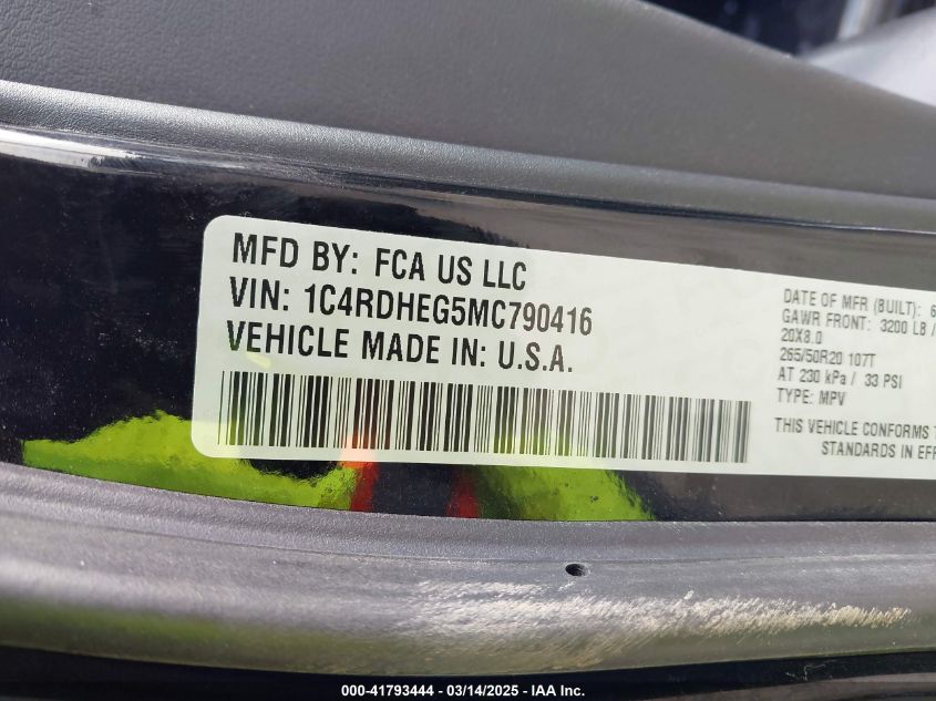 2021 DODGE DURANGO | 1C4RDHEG5MC790416