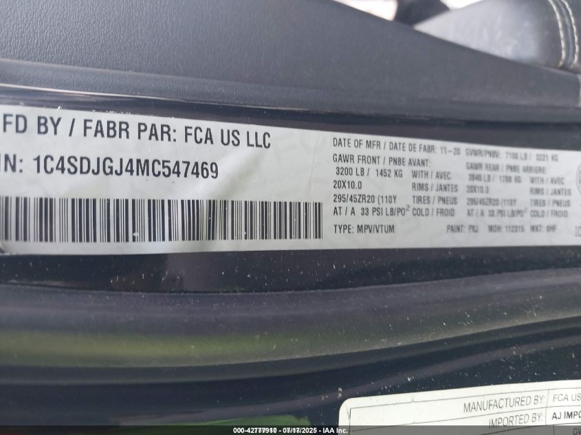 2021 DODGE DURANGO | 1C4SDJGJ4MC547469