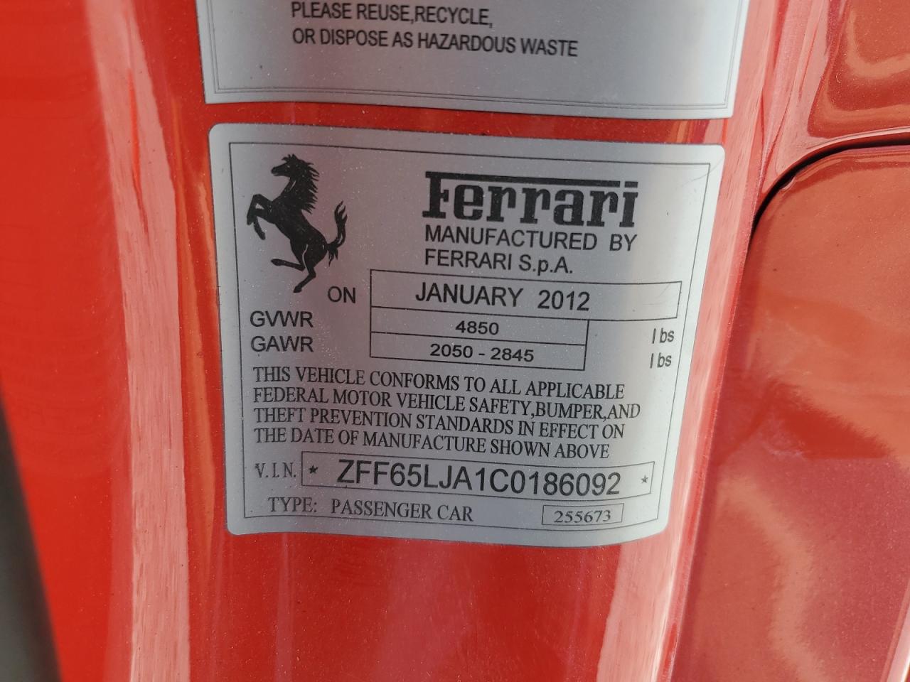 2012 FERRARI CALIFORNIA | ZFF65LJA1C0186092