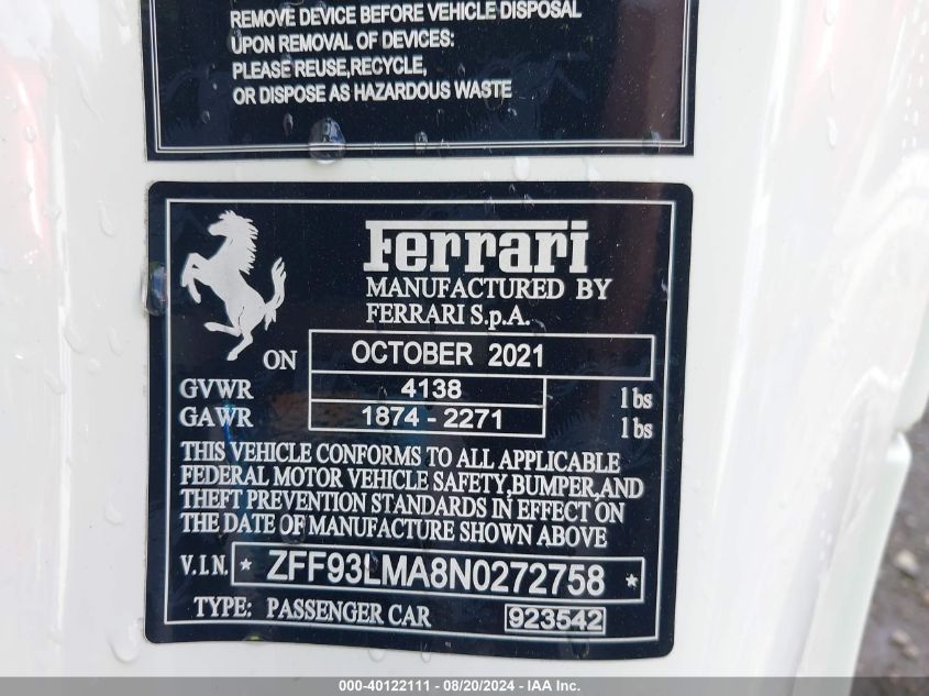 2022 FERRARI F8 SPIDER | ZFF93LMA8N0272758