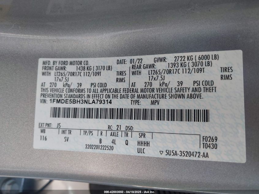 2022 FORD BRONCO | 1FMDE5BH3NLA79314
