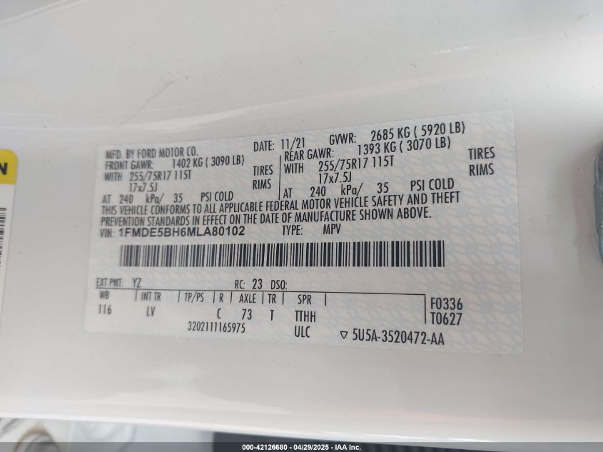 2021 FORD BRONCO | 1FMDE5BH6MLA80102