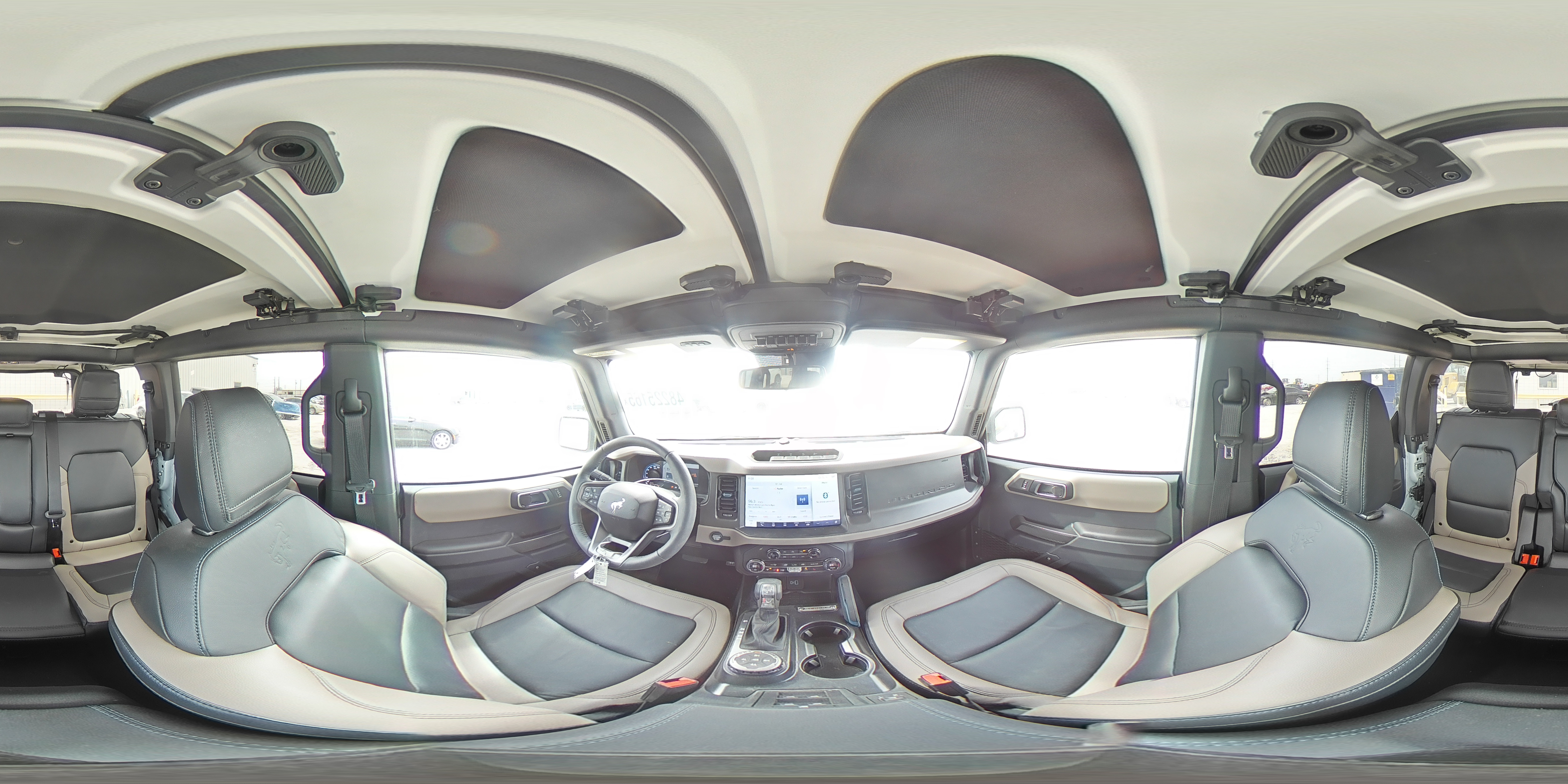 Inside, the Bronco is all about functional durability with a modern twist. Materials are built for abuse: marine-grade vinyl, rubberized flooring with drain plugs, and silicone-sealed switches in off-road trims. Higher trims add leather seats, 12-inch SYNC 4 infotainment, digital clusters, B&O audio, and unique contrast stitching. The dashboard features grab handles, MOLLE storage, and overhead aux switches — tools, not ornaments. The layout is wide, upright, and designed to accommodate open-air driving without sacrificing refinement.