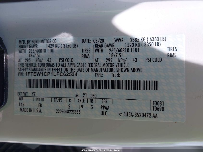 2020 FORD F-150 | 1FTEW1CP1LFC62534