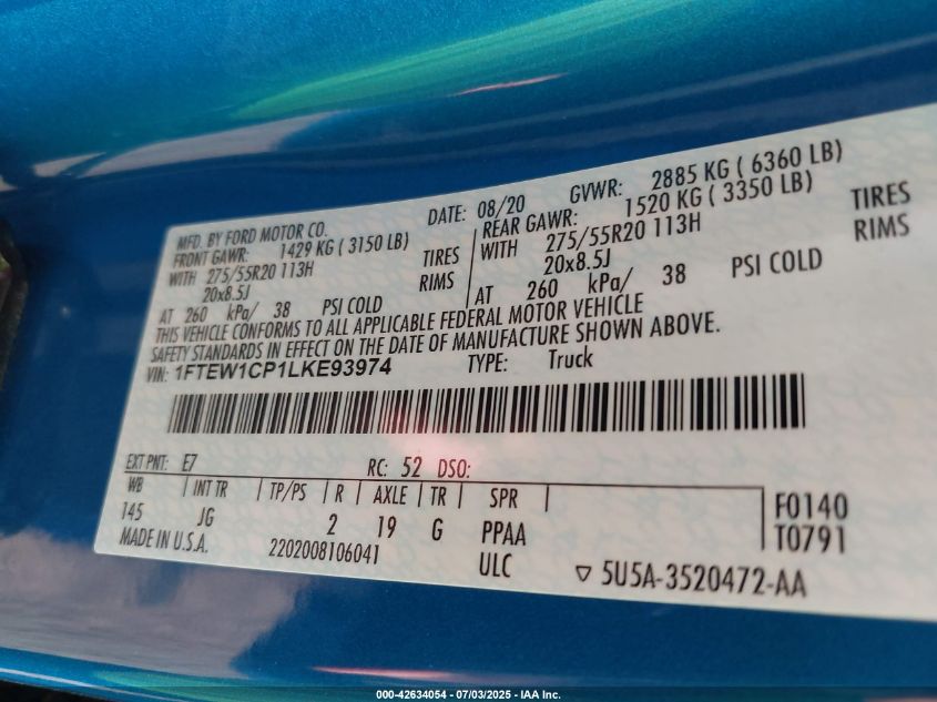 2020 FORD F-150 | 1FTEW1CP1LKE93974
