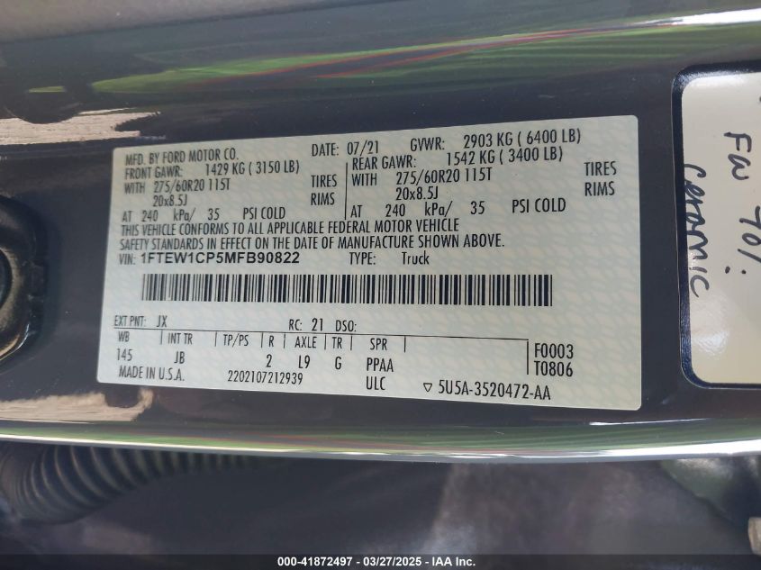 2021 FORD F-150 | 1FTEW1CP5MFB90822