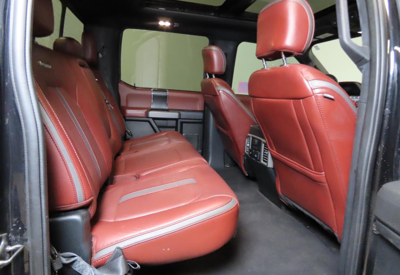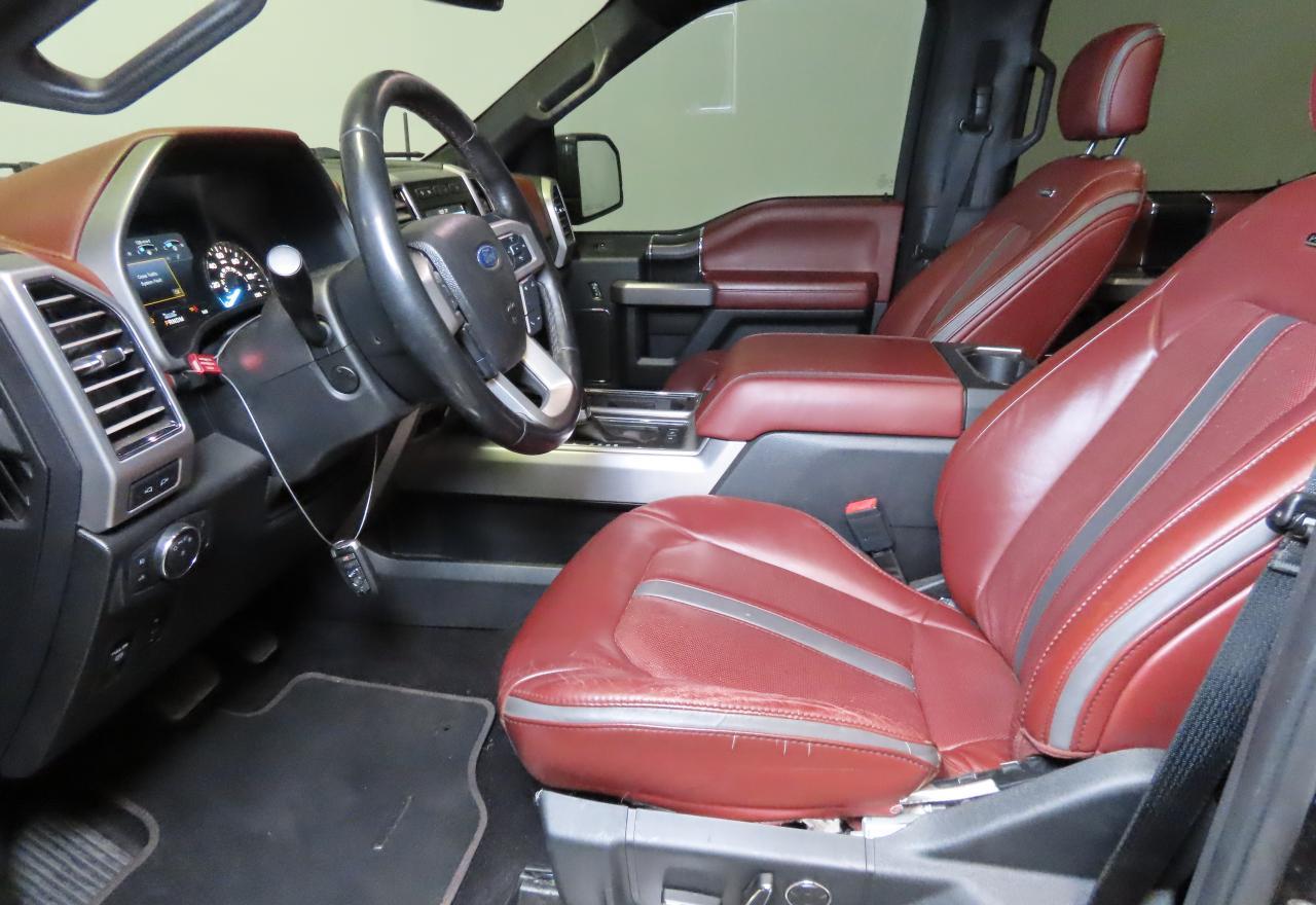 Interior trims varied widely across trims, from work-grade vinyl in XL to King Ranch and Platinum editions with two-tone premium leather, wood accents, ambient lighting, and advanced infotainment (SYNC 3 with 8” touchscreen). Later years included B&O audio, heated/cooled seats, rear sliding glass with defrost, and twin-panel moonroof.