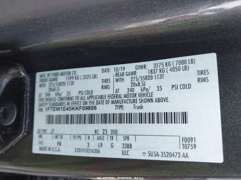 2019 FORD F-150 | 1FTEW1E45KKF09806