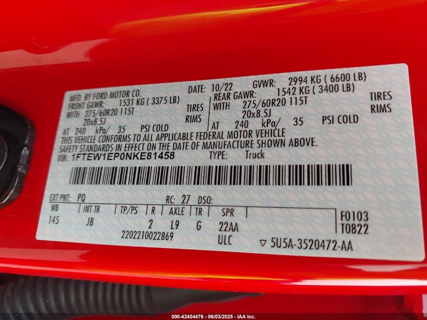 2022 FORD F-150 | 1FTEW1EP0NKE81458