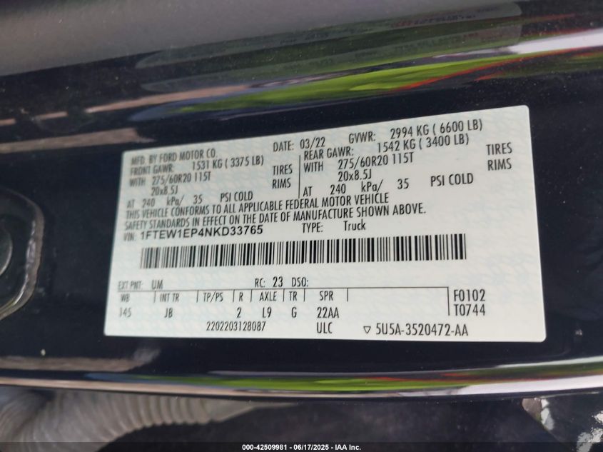 2022 FORD F-150 | 1FTEW1EP4NKD33765