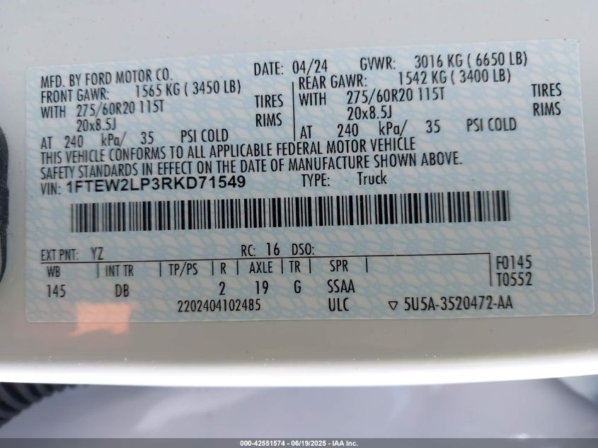 2024 FORD F-150 | 1FTEW2LP3RKD71549