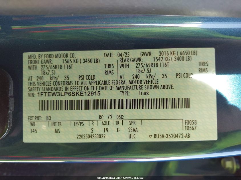 2025 FORD F-150 | 1FTEW3LP6SKE12915