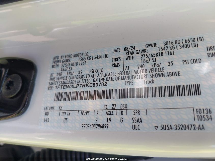 2024 FORD F-150 | 1FTEW3LP7RKE80702
