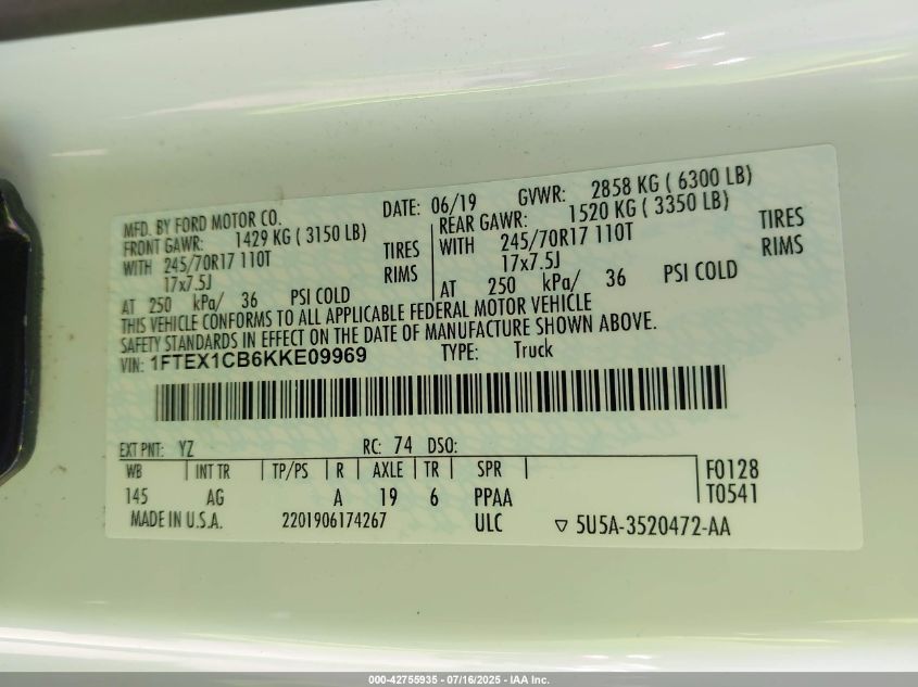 2019 FORD F-150 | 1FTEX1CB6KKE09969
