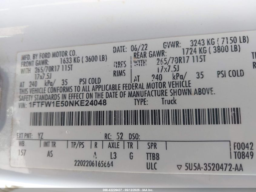 2022 FORD F-150 | 1FTFW1E50NKE24048