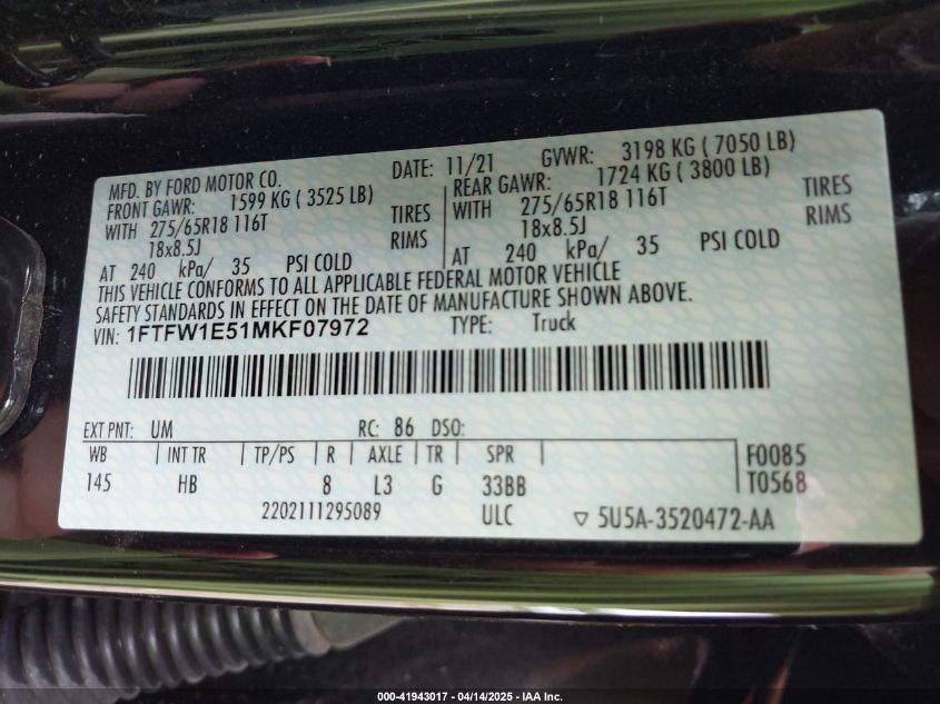 2021 FORD F-150 | 1FTFW1E51MKF07972