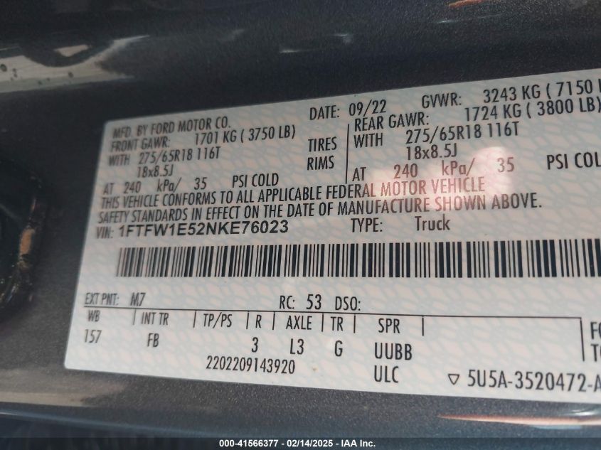 2022 FORD F-150 | 1FTFW1E52NKE76023